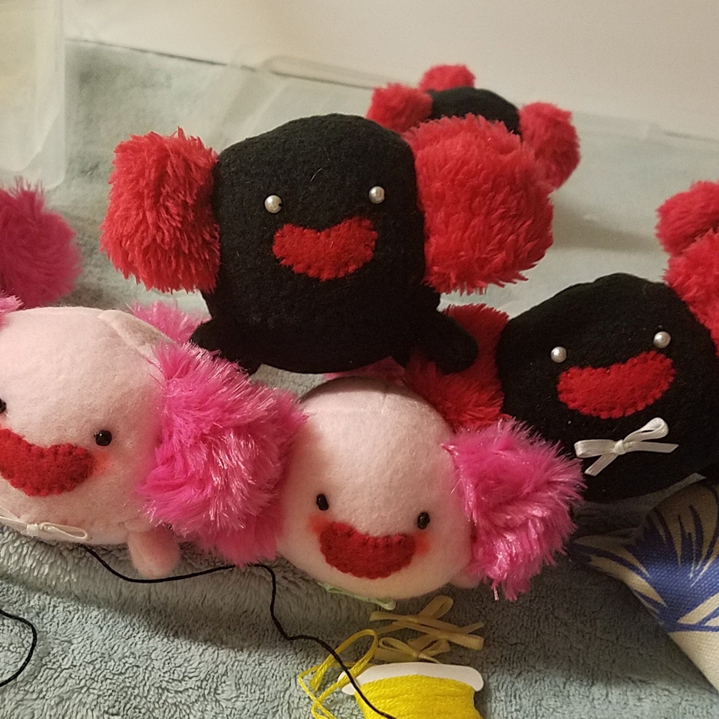 In my third year of working with WWU QueerCon, I decided to return as an artist table as well as being the creative director. Along with selling embroidered patches, beaded accessories, and buttons, I designed a pattern the make miniature axolotl plushies. And i made a BOATLOAD of them! I made about 26 in total, both in the black and red color scheme and the classic pink. I set their price at $20 and every one sold!